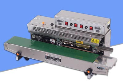 当封口机打开时,电子热敏元件产生的热量使密封材料通过温度控制仪所需的温度和速度以及速度调节塑料包装袋由传送带传递,其密封部分被送到在两个运行的密封编织物之间,在加热区域进行两个加热器的挤出,使塑料薄膜在加热后粘合,然后将袋子冷却在冷却区域,其密封部分由图案滚筒或滚筒轮子滚动制成 带有条纹或网纹和必要的颜色带驱动部分由密封带,铅带和输送带组成,所有这些都由电机驱动同步运行。